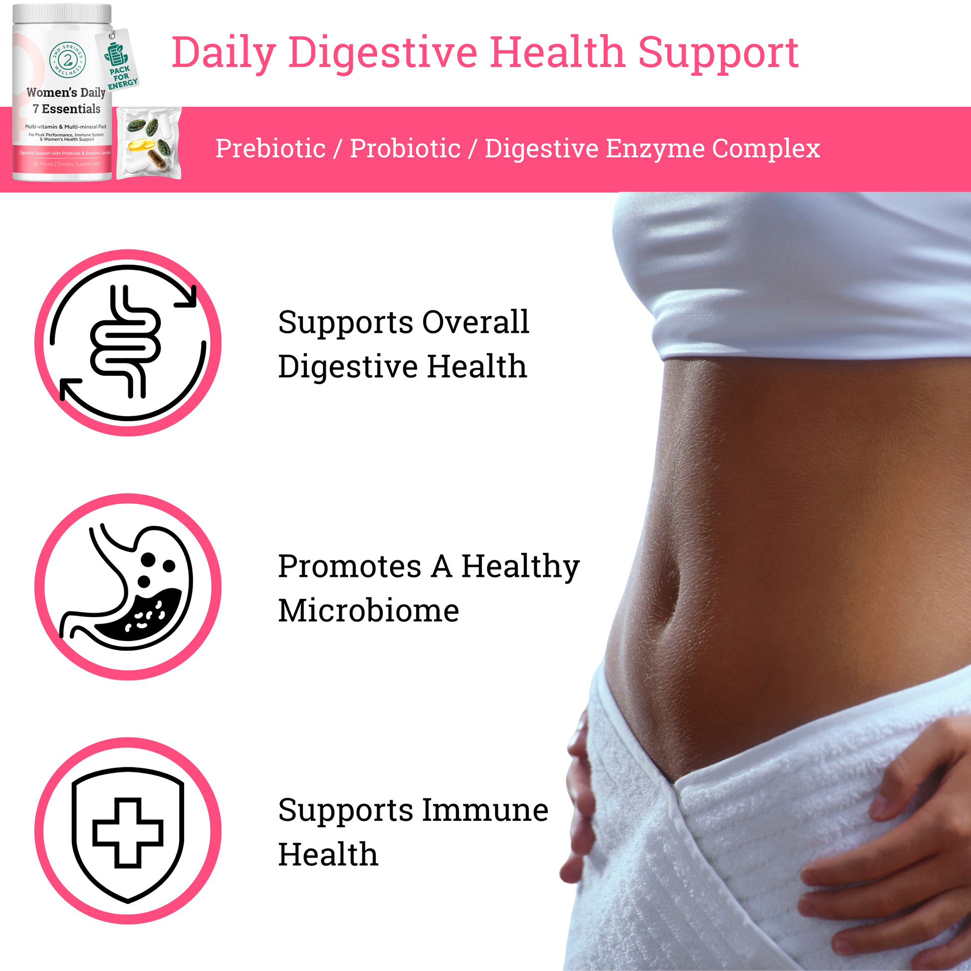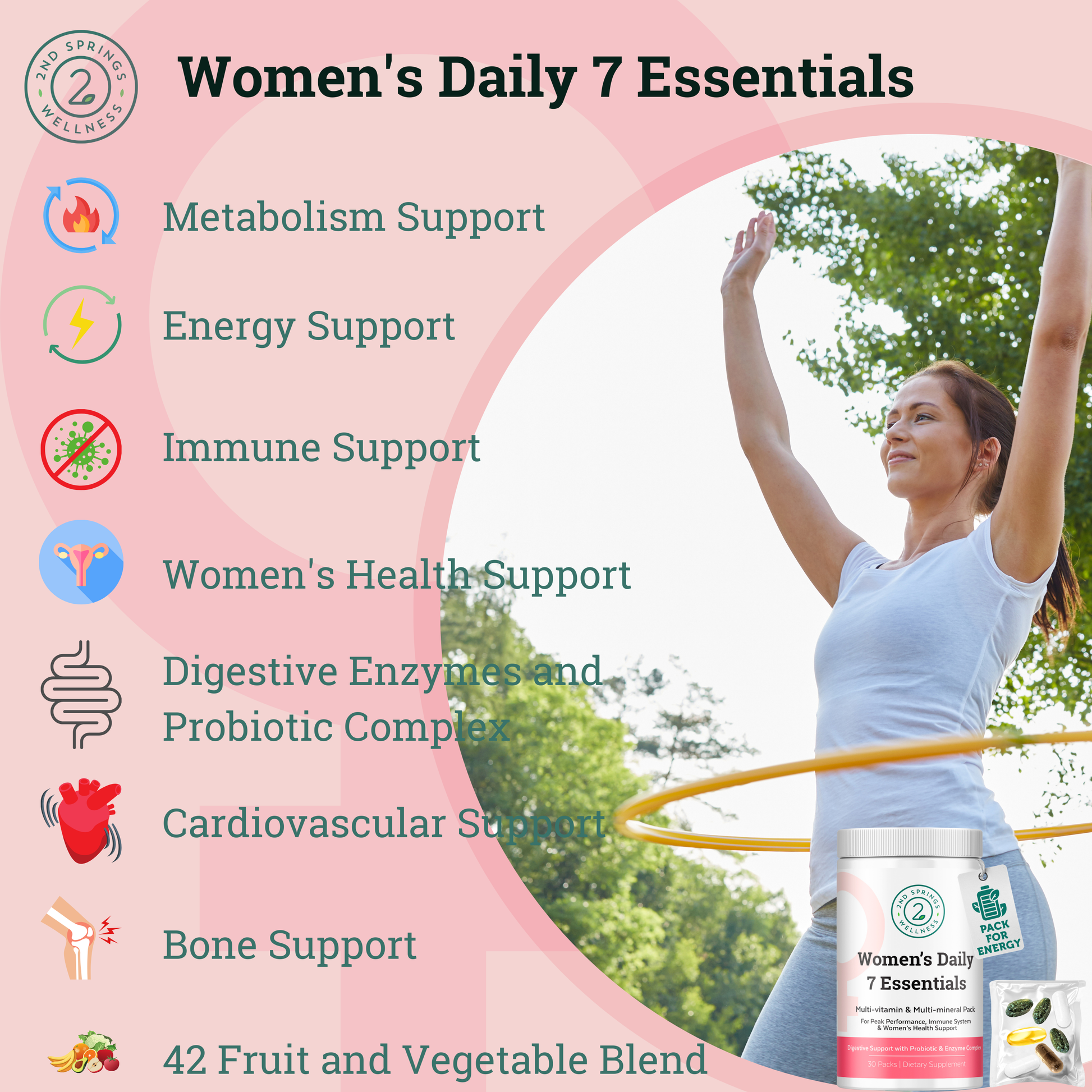Comprehensive Daily Support: Our 2nd Springs Daily 7 Essentials vitamin pack for women provides a complete blend of essential vitamins, minerals, fish oils, probiotics, prebiotics, and digestive enzymes.